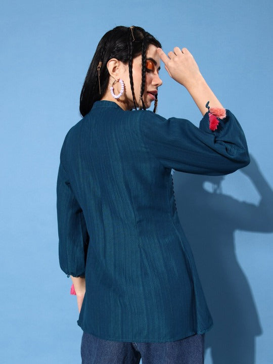 BLUE EMBROIDERED PUFF SLEEVES A-LINE TOP
