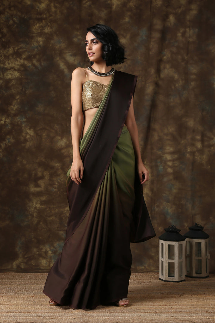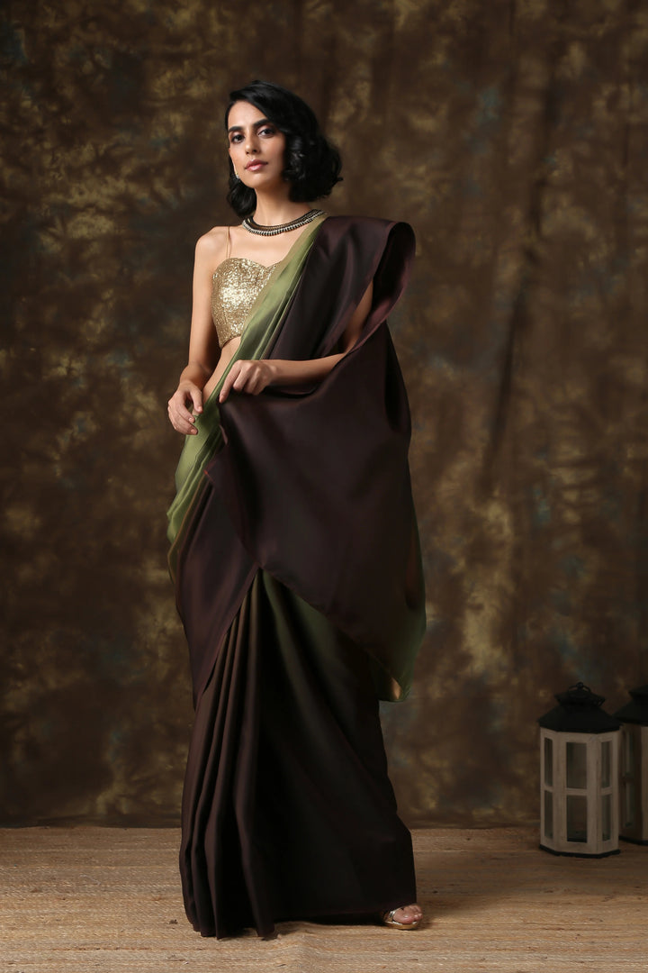DARK CHOCOLATE & GREEN SATIN OMBRE' SAREE
