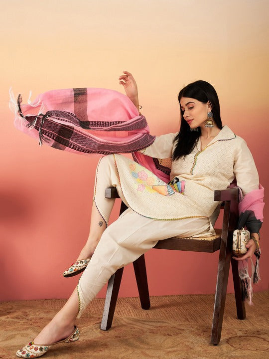 WHITE COTTON THREAD WORK PLEATED SHORT KURTI