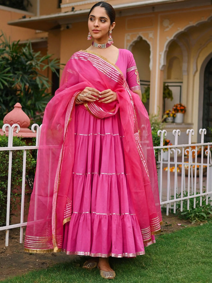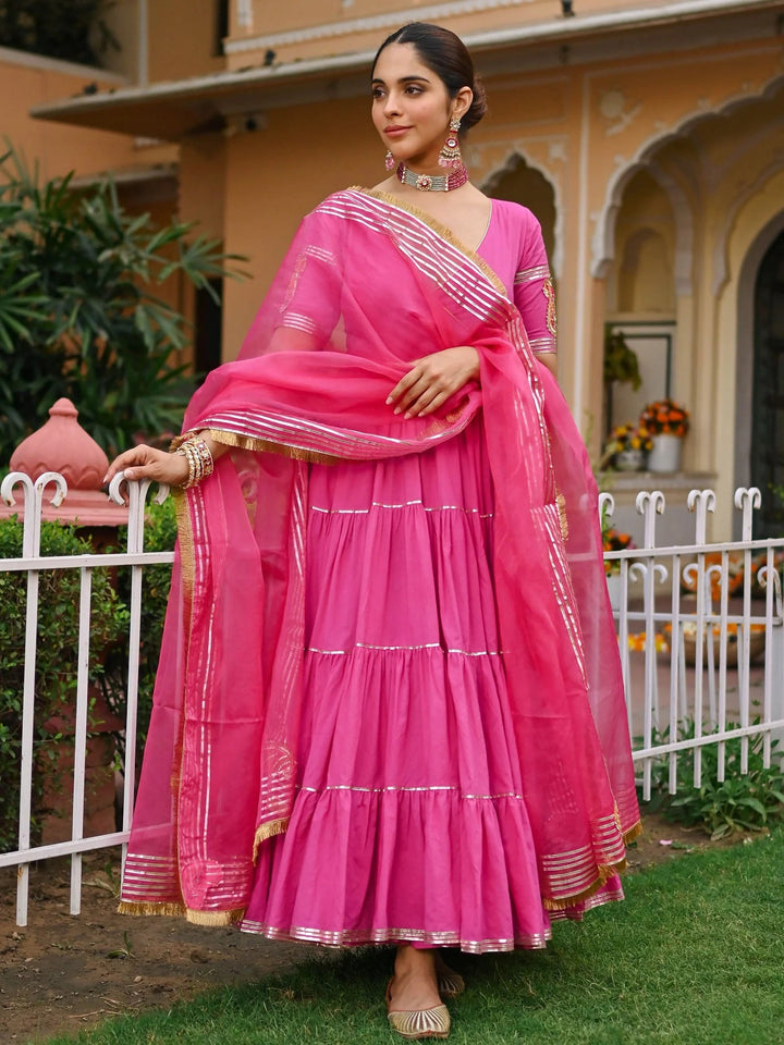 The Pink Paisley Gota Anarkali Set is a graceful ensemble crafted from premium cotton, featuring a charming Anarkali silhouette. Paired with a delicate organza dupatta, this set exudes ethereal beauty. Intricate Gota detailing embellishes the dupatta, Anarkali, and pants, adding a touch of opulence to the ensemble. Whether it's a festive celebration or a special occasion, this ensemble effortlessly combines traditional elegance with contemporary style, making it a timeless addition to your wardrobe.