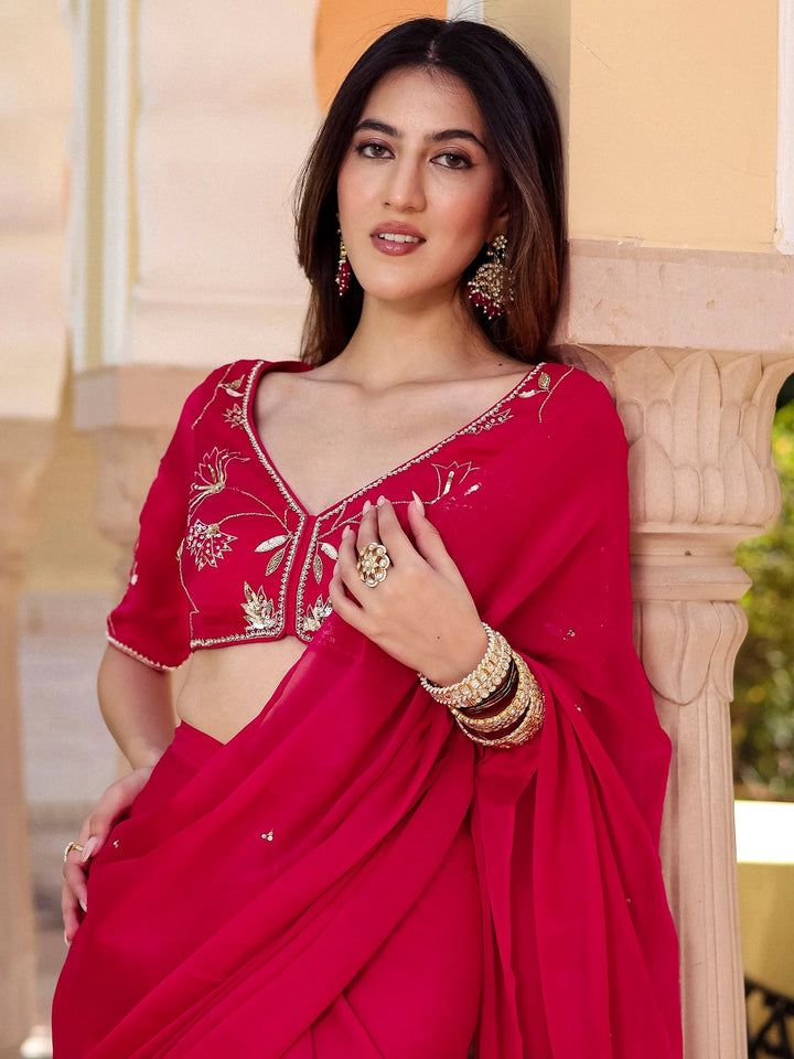 Radiate timeless elegance in this RED Pre-Draped Saree, a symphony of grace and charm. With its meticulously draped silhouette and delicate hues, it effortlessly combines tradition and contemporary allure, making every moment a celebration of style.