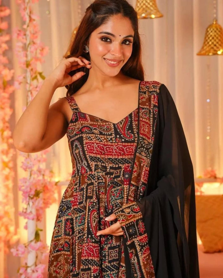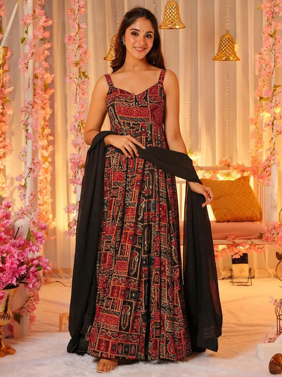 This beautiful Anarkali kurti with dupatta is crafted from soft and breathable rayon fabric, offering both comfort and elegance. Designed in multi-colors with striking traditional Ajrakh-inspired block prints, it makes a perfect choice for festive occasions, ethnic gatherings, or casual traditional outings. The flared silhouette with sleeveless strappy shoulders ensures a modern yet graceful look. Paired with a solid black dupatta, it enhances the charm and versatility of the outfit. Lightweight and flowy, it allows easy movement while keeping you stylish all day. Available in multiple sizes, this timeless ethnic piece is a must-have addition to every woman’s wardrobe.