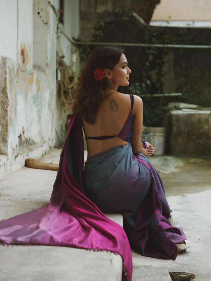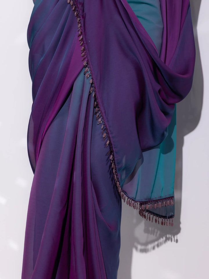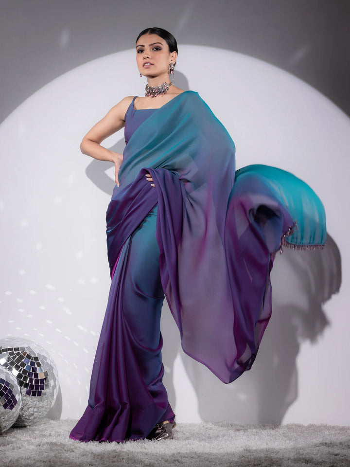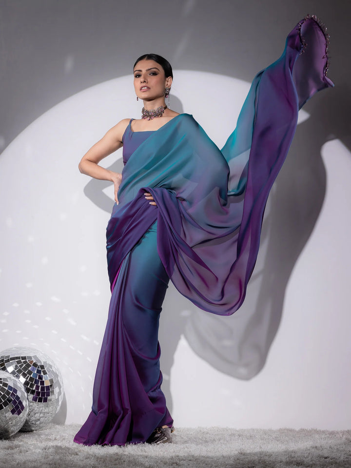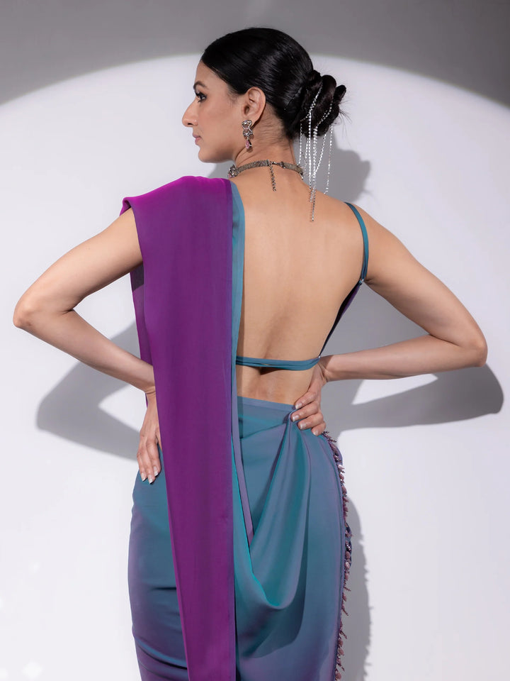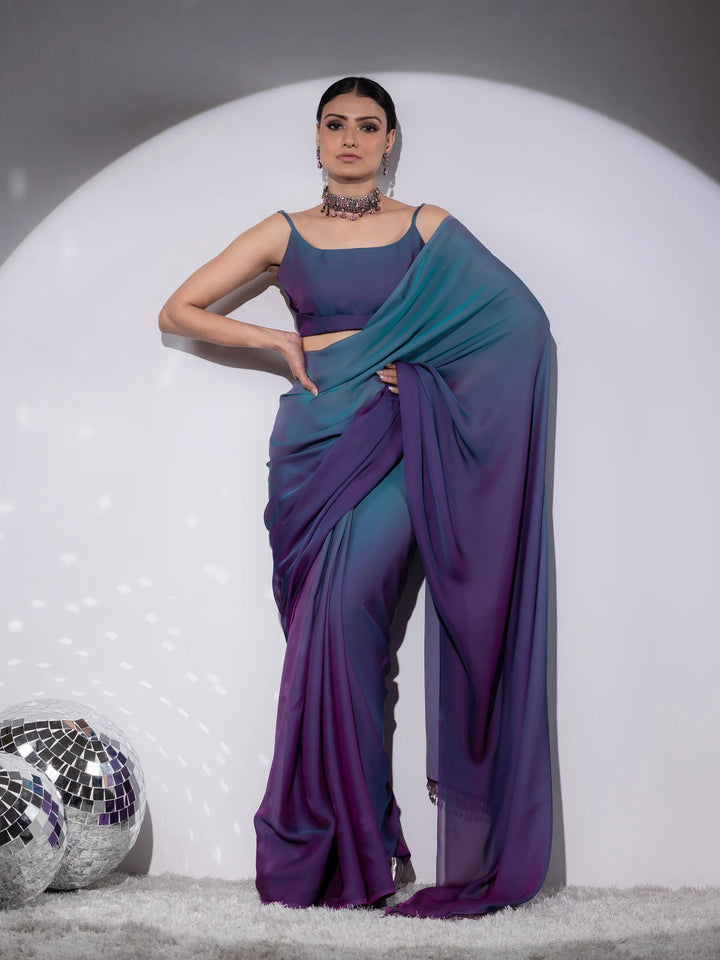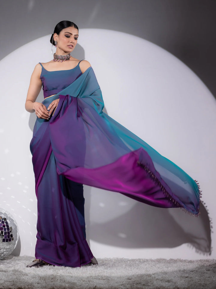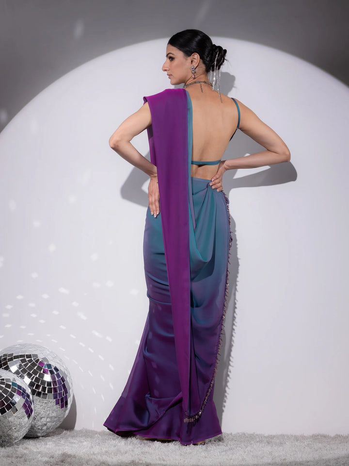 Dip your beauty into this Elegant ,Gorgeous and Unique Plum & Teal Ombre with dual shades interwoven ! So light that it makes you look a size smaller