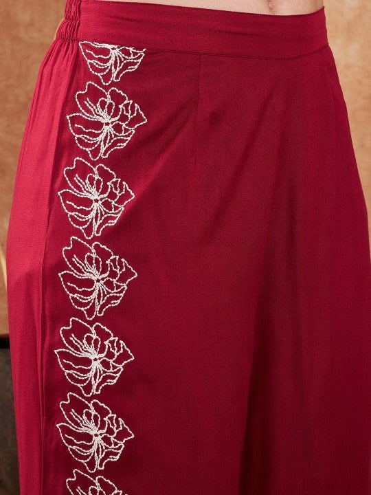 - Maroon embroidered palazzo, has an partially elasticated waistband with slip-on closure