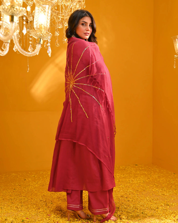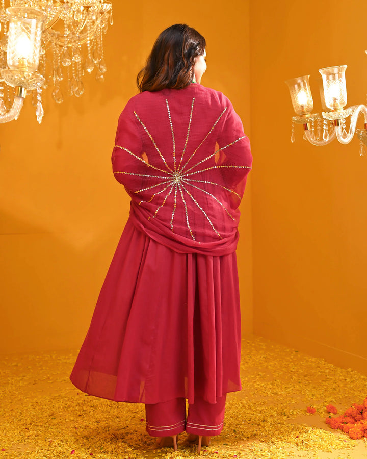 Siya Cotton Suit Set dazzles in a bright red hue, crafted from plush cotton for ultimate comfort. The flared Anarkali-style kurta features a V-neck embellished with intricate detailing and three-quarter sleeves, adding a touch of elegance. Paired with matching pants, the ensemble is completed by an embellished Kota Doriya dupatta, making it an ideal choice for festive occasions and celebrations.