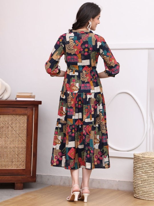 Black abstract printed a-line dress, Mandarin collar, Three-quarter, regular sleeves, Midi length in flared hem