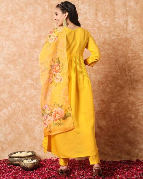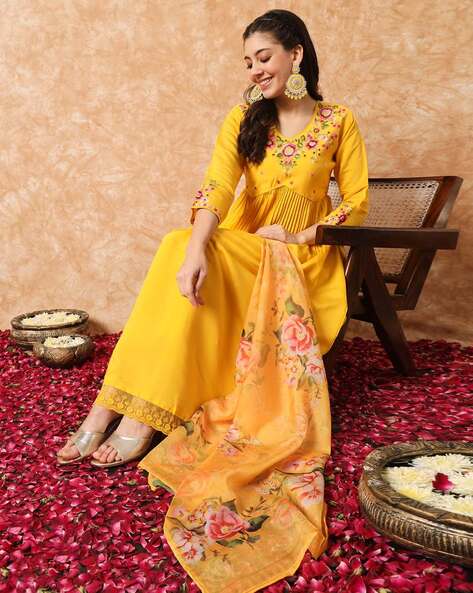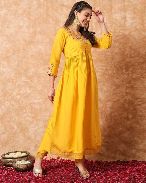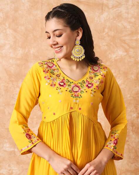 This vibrant yellow kurta is crafted from a soft cotton blend, designed for both comfort and style. It features beautiful multicolor floral thread embroidery on the neckline, yoke, and sleeve cuffs, adding a festive charm. The V-neck and pleated front enhance its graceful silhouette, making it perfect for casual gatherings, festive occasions, or day outings. Lightweight and breathable, it ensures ease of wear throughout the day. The kurta offers a regular fit with a flared hemline, styled to suit all body types. Available in sizes S to XXL, this elegant piece is made in India and is best cared for with gentle hand wash or dry clean.